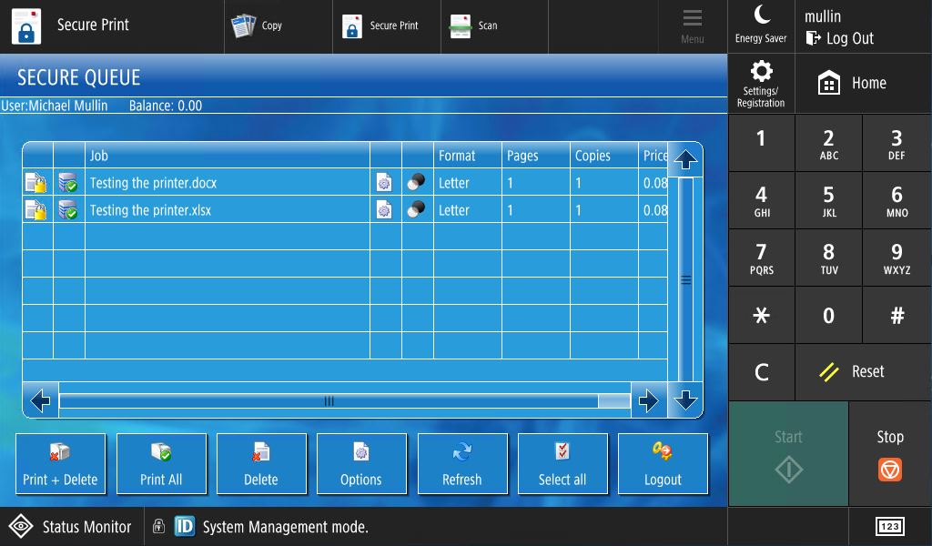 4. At this time, you will be presented with a list of your prints and a number of items below. From these items you can choose "Print + Delete" for example, which will print the job and delete it from the queue, or "Print + Keep" which prints the job, but keeps it in the queue if you wish to print the same thing again at a later time. Tap the name of the file you wish to print or choose "Select all" from the options to print all jobs.