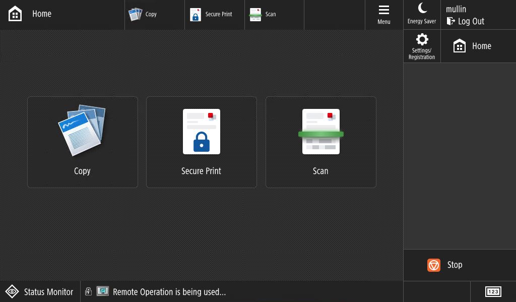 3. Once you have logged in, you will see a collection of buttons. Depending on the printer model this screen may be slightly different. In all cases, to dispense your prints choose the button called "Secure Print."