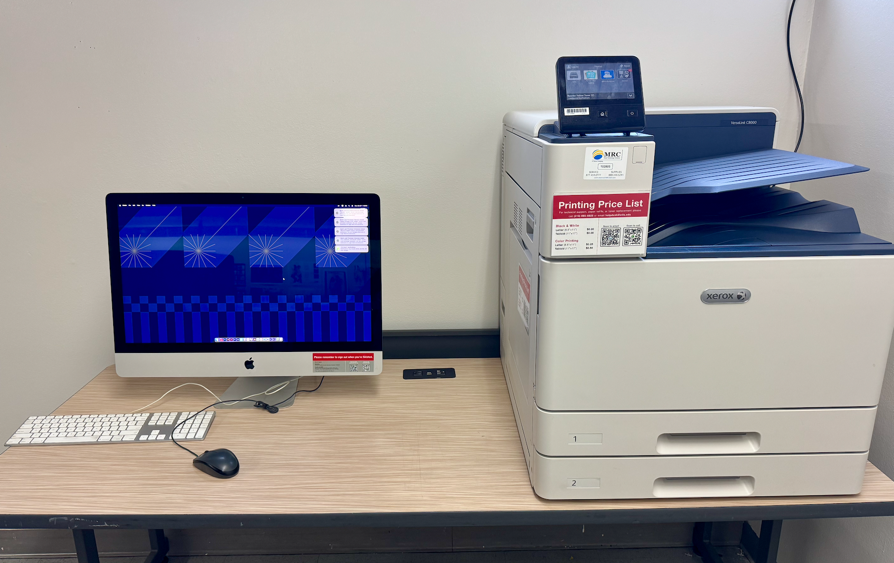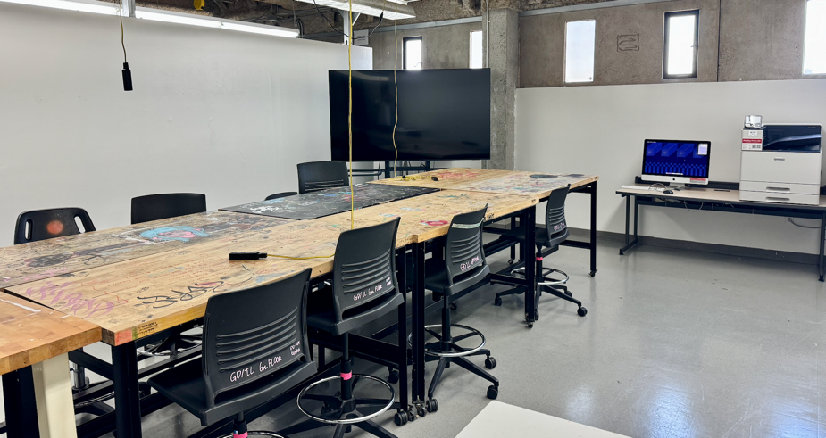 Room A603 is an open studio equipped with an iMac and a color printer. A mobile cart is also available upon request through the Media Services department.
