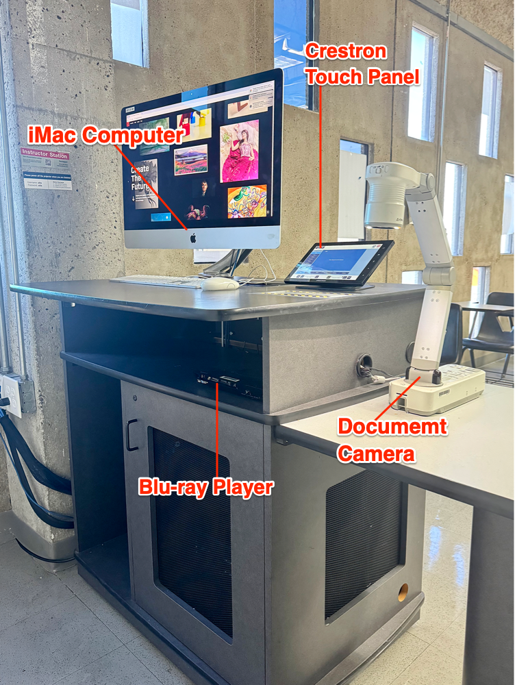 The Smart Classroom Podium is equipped with a computer, Blu-ray player, document camera, and a Crestron touch panel that centrally controls all audiovisual equipment, including projectors, screens, and microphones. To operate the system, tap the touch panel to wake it, then select your desired input source (such as a laptop or document camera) from the left side of the screen to display it. You can adjust the volume, mute audio or video, and when finished, select “ALL Off” to power down the equipment.