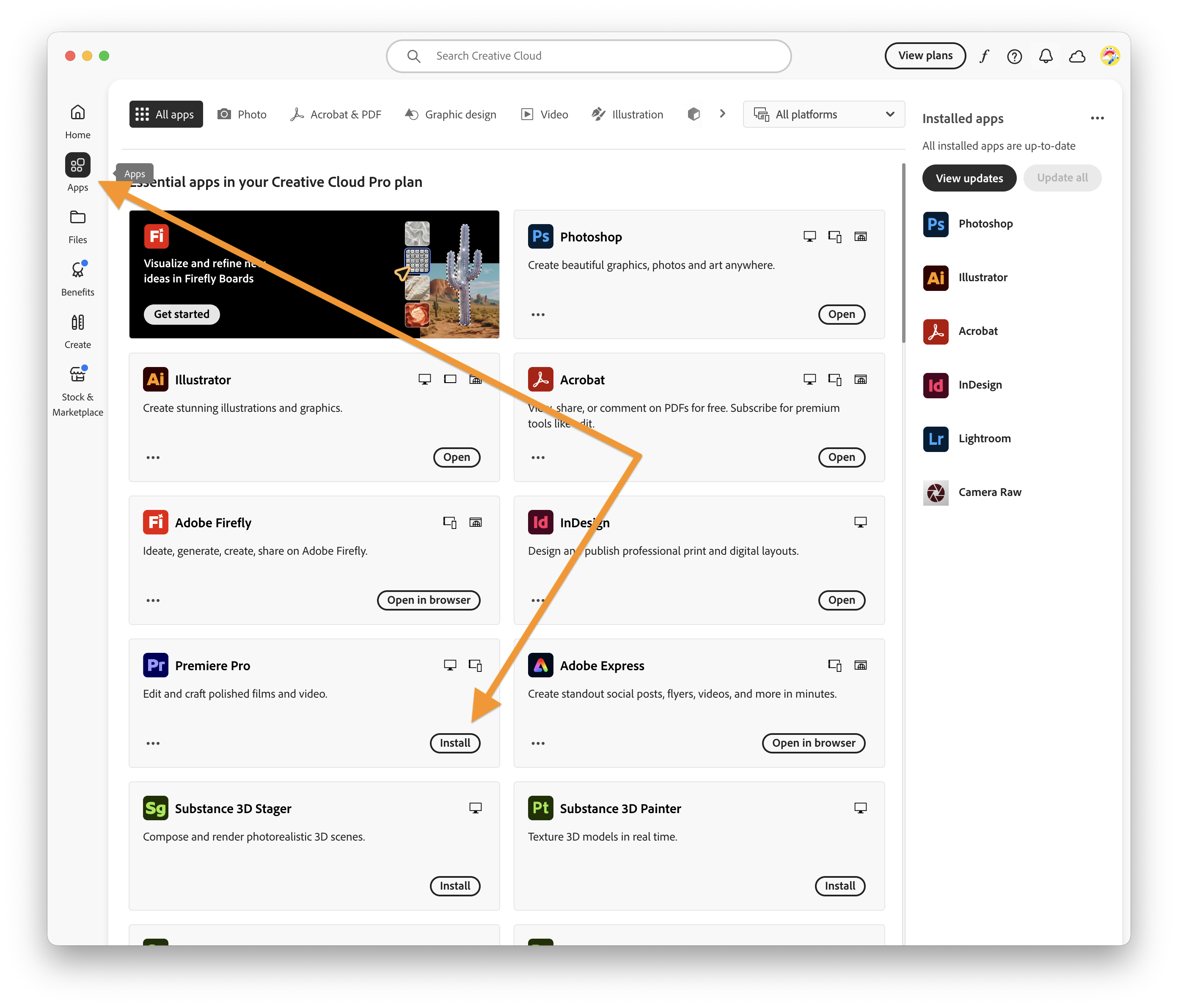5. Once the Creative Cloud app loads, find the tab called "Apps" on the left side of the window. Here you will see the list of all available Adobe Apps. To install them on your computer, click the "Install" button near the app icon. Give it time to download and install. When it is complete, the button will now read "Open."