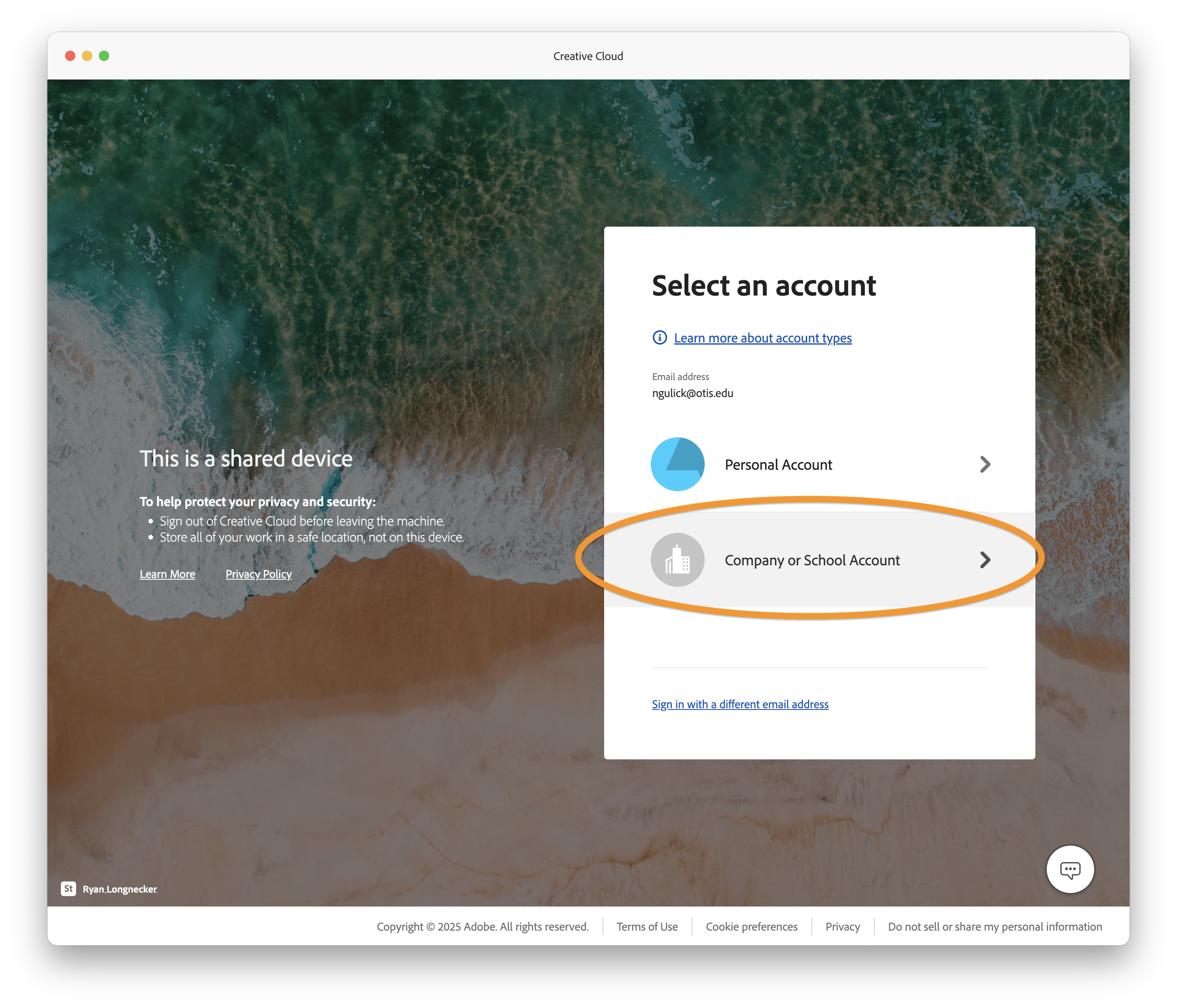 3. At the "Select an account" screen, choose "Company or School Account." You will then be prompted to create a password for your Adobe Creative Cloud account. Please create a password with at least 8 characters, one number, one uppercase letter, and one special character.