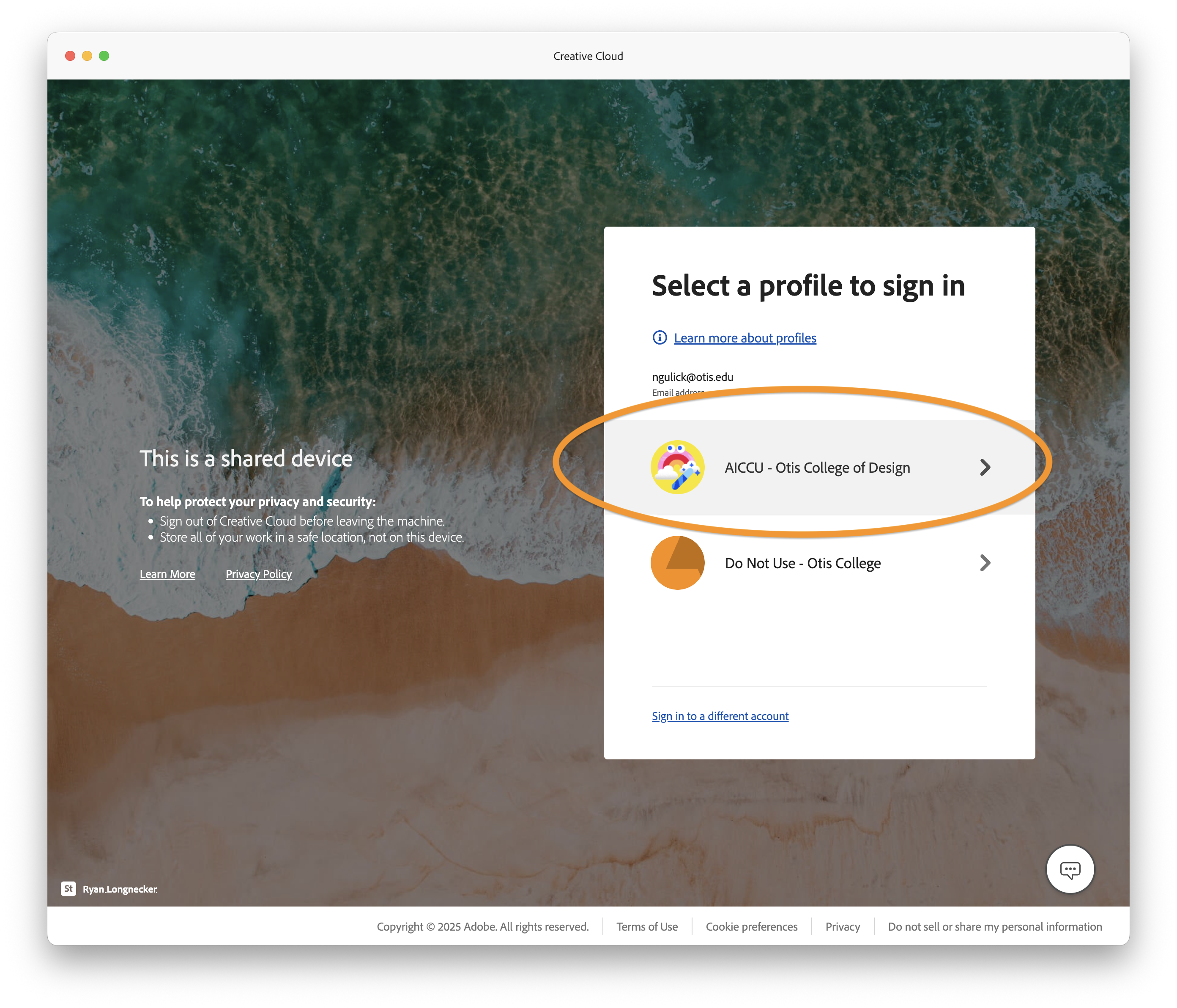 4. At the "Select a profile to log in" screen, "choose AICCU - Otis College of Design."