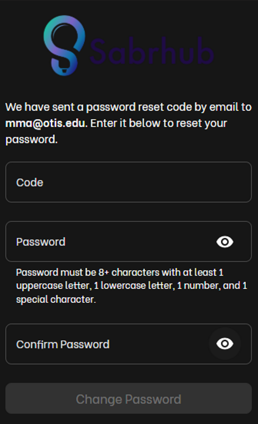 - Enter the 6 digit code then enter your new password and confirm your password. Then click "Change Password".